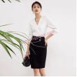 - Thiết kế theo form dáng bút chì cổ điển với gam màu đen cổ điển, nhưng được tạo điểm nhấn tại vạt phối viền màu thân trước, khuy cài kim loại nổi bật, tạo nên sự tinh tế và cách tân mới mẻ dành cho những mẫu đầm bút chì.