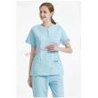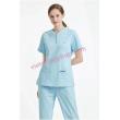 - Kiểu cổ chữ V, may viền cùng màu, điểm nhấn là 2 cúc áo trước ngực ấn tượng. Tay áo dáng ngắn thuận tiện khi thao tác chuyên môn.