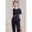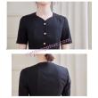 - Áo lễ tân được may kiểu cổ tim cách điệu mềm mại, hàng khuy ánh kim được đính chắc chắn nổi bật, thu hút mọi ánh nhìn.