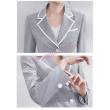 - Tạo hình cổ vest bẻ cách điệu, phối viền màu đối lập nổi bật, tạo sự mới mẻ, hút mắt, tăng thêm tính thời trang, cá tính. Chi tiết may may nắp túi bản to đã cho thấy sự tinh tế và tỉ mỉ của những nhà thiết kế.