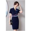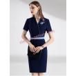 - Kiểu cổ chữ V đắp chéo cách điệu, tay ngắn tiện dụng, chân váy ôm nhẹ và xẻ tà phía sau, quyến rũ, sang trọng mà không gò bó hay vướng víu khi di chuyển.